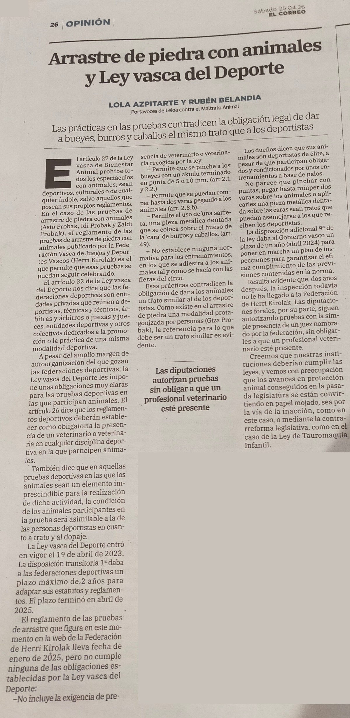 Artículo de Lola Azpitarte y Rubén Belandia portavoces de Leioa contra el Maltrato Animal, publicado en El Correo el 25 de abril de 2026.
